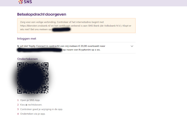 Na het selecteren van “Bank Transfer kon ik SNS Bank vinden en Instant Banking gebruiken als mijn betaalmethode via Yapily Connect. Nadat ik het gewenste stortingsbedrag had ingevoerd, hoefde ik alleen de transactie te bevestigen. Het geld werd direct bijgeschreven op mijn account.