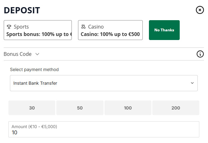 - Stort geld: Kies je favoriete betalingsmethode en stort minimaal €10 om je bonus op te eisen.