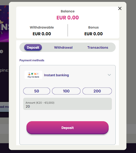 Na het kiezen van “Instant Banking” gaf ik het bedrag op dat ik wilde storten. Bij Slotmonster is het minimumbedrag €20, wat het voor de meeste spelers toegankelijk maakt.