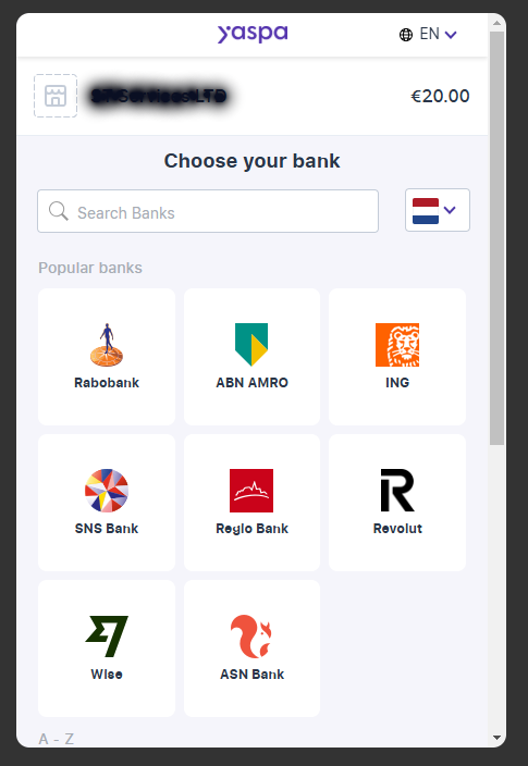 In de volgende stap verscheen er een lijst met populaire banken, zoals Rabobank, ABN AMRO, ING, SNS Bank, RegioBank, Revolut, Wise en ASN Bank. Ik koos voor SNS Bank, maar er is ook een handige zoekfunctie beschikbaar voor het vinden van andere ondersteunde banken.