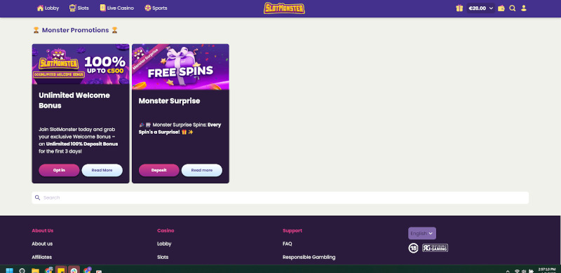 Het design van SlotMonster is modern en aantrekkelijk, met een overzichtelijke interface die zowel nieuwe als ervaren spelers aanspreekt. De visuele elementen zijn zorgvuldig ontworpen om een plezierige en gebruiksvriendelijke omgeving te creëren.
